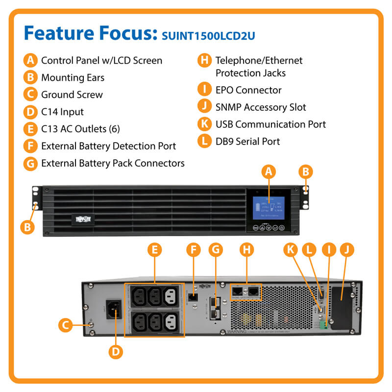 Tripp Lite SmartOnline Series 1500VA Double-Conversion Rack/Tower UPS, 2U, Extended Run, SNMP Card Option, LCD, USB, DB9 SUINT1500LCD2U