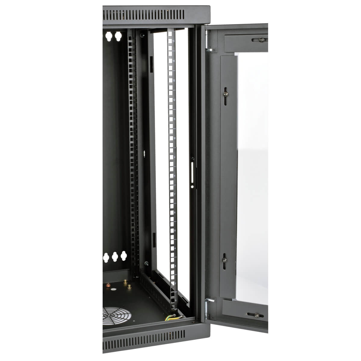 The SRW15USG comes fully assembled and ready to mount to the wall. Square and 12-24 threaded mounting holes and numbered rack spaces make equipment installation easy. The vertical mounting rails adjust in 7/8-inch increments to house equipment up to 20.5 inches deep, such as network switches and patch panels.